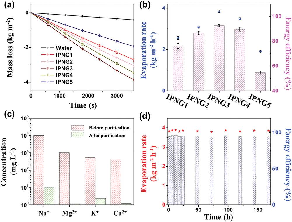 图四、在太阳照射下,太阳能蒸汽产生和海水淡化(a)在太阳光照射下,IPNGs造成的随时间变化的水的质量损失;