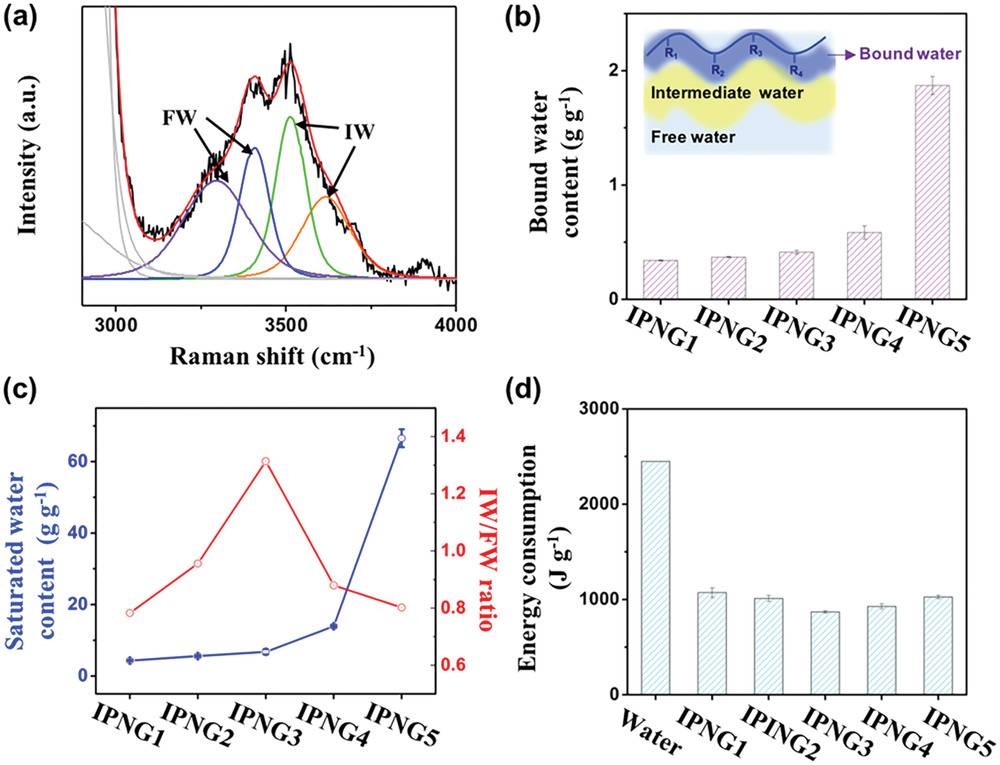 图三、基于IPNG的有效水活化(a)具有拟合曲线的拉曼光谱,显示IPNG中的自由水和中间水;