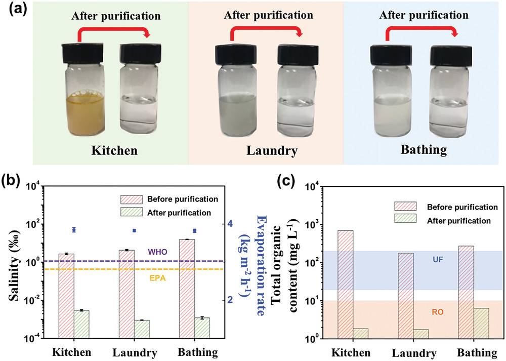 (b)净化前后,废水样品的盐度以及在厨房、洗衣房和浴室产生的废水中IPNG的蒸发速率;