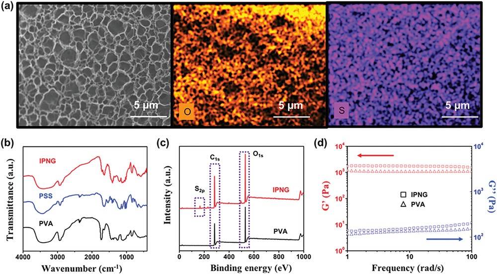 (b)PVA、PSS和IPNG的FT-IR光谱,表明IPNG中存在PVA和PSS;