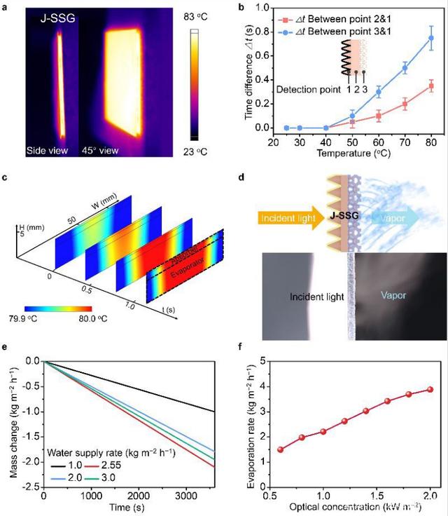 图4. J-SSG系统的传热能力和太阳能光热蒸发性能:(a) J-SSG 1个太阳照射下横截面(左半部分)和45度倾斜角(右半部分)下观察的红外成像图;(b)红色曲线:点2和点1达到相同温度的时间差,蓝色曲线:点3和点1达到相同温度的时间差,点1、2和3分别位于吸收器、J-SSG中部和蒸发器处;(c) COMSOL对J-SSG中热扩散的模拟结果,图为J-SSG在79.9 °C至80.0 °C下的温度分布情况,图像捕获的时间间隔为0.4秒;(d) J-SSG系统实现快速太阳能驱动光热水蒸发过程示意图,照片为J-SSG产生的蒸汽图;(e) J-SSG在不同供水率下水蒸发过程随时间变化的累积重量损失;(f) J-SSG在太阳照射从0.6至2.0 kW m2时的WER值。