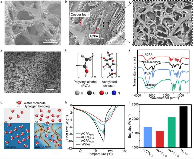 图3. J-SSG器件中水蒸发侧的表征与性能测试:(a)初始铜泡沫的SEM图;(b)含有ACPA铜泡沫的SEM图,显示出ACPA中微米级的多孔结构;(c) ACPA中微米级孔的放大SEM图;(d) ACPA中纳米级孔的再放大SEM图;(e) PVA和乙酰化壳聚糖的分子结构示意图,可以得出ACPA中含有羟基、氨基和酰胺等多种亲水性官能团;(f) PVA、壳聚糖、壳聚糖/PVA气凝胶和ACPA的傅里叶变换红外光谱;(g)体相水和ACPA水化聚合物网络中的水分子示意图,体相水中充满着正常的水/水氢键(深蓝色),而ACPA中具有水/聚合物氢键(橙色部分)和减弱的水/水氢键(浅蓝色部分),从而使得水更容易蒸发;(h)差示扫描量热法测定水在ACPA和纯水中相变的能量变化曲线;(i)计算得出不同PVA/壳聚糖比例下纯水和ACPA中水的蒸发焓。