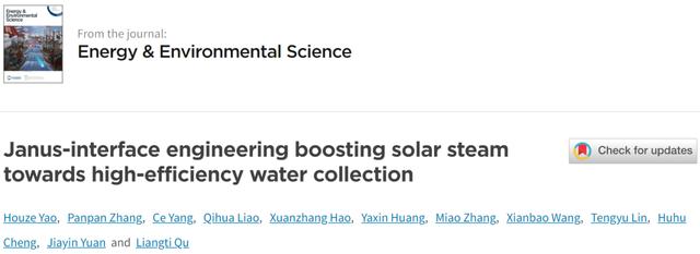Houze Yao, Panpan Zhang, Ce Yang, Qihua Liao, Xuanzhang Hao, Yaxin Huang, Miao Zhang, Xianbao Wang, Tengyu Lin, Huhu Cheng, Jiayin Yuan, Liangti Qu, Janus-interface engineering boosting solar steam towards high-efficiency water collection. Energy Environ. Sci.2021, DOI: 10.1039/D1EE01381E.