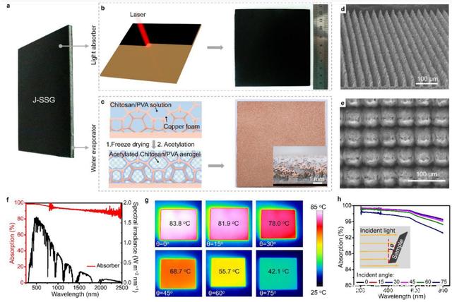 图2. J-SSG的制备过程和光热转换性能:(a)以45度角拍摄的J-SSG (100 cm2)照片;(b)太阳能吸收表面的制备流程示意图,其中照片为铜箔经激光加工后的黑色表面;(c)水蒸发表面的制备流程示意图,其中照片和插图分布为水蒸发器侧的表面与横截面,在冷冻干燥后,多孔聚合物蒸发器被均匀填充在铜泡沫骨架中;(d)太阳吸收表面的SEM图;(e)太阳吸收表面的放大SEM图;(f)太阳吸收表面的紫外-可见-近红外光谱,其中黑线为AM 1.5 G时的归一化光谱太阳能照射密度;(g)红外图显示J-SSG吸收器在一个太阳照射下达到稳定状态后,不同入射角(0°、15°、30°、45°、60°和75°)时的温度;(h)不同入射角下J-SSG吸收器的吸收光谱,图示为不同入射角下的光吸收示意图。