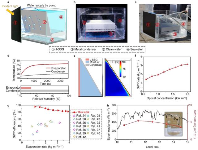 图5. J-SSG基太阳能海水淡化系统的建立和原理验证:(a) J-SSG基太阳能海水淡化系统示意图,包括太阳能吸收和转换、水蒸发、水源储存/供应和水冷凝/收集系统;(b) J-SSG基太阳能海水淡化系统的左侧照片,其中清洁水被染成蓝色以便在视觉上与外部海水区分;(c) J-SSG基太阳能海水淡化系统在室外试验时的实际照片;(d) J-SSG基太阳能海水淡化系统中蒸发器和冷凝器的实时温度变化,直方图为蒸发器和冷凝器处于稳定状态时的表面湿度;(e) 太阳能海水淡化系统的理论模拟,左侧为冷凝系统的建模(与实际尺寸相对应),右侧为蒸发器和冷凝器之间湿度的模拟平衡分布;(f) J-SSG基太阳能海水淡化系统在0.6~2.0 kW m-2不同太阳照射下的SWP率;(g) J-SSG基太阳能海水淡化系统的SWP效率,x轴为不同材料在开放系统中的WER值,可以看出在不同蒸发条件下,本文中的太阳能海水淡化系统具有最高的SWP效率;(h)室外实验中太阳照射对J-SSG系统和SWP率的影响,该实验于2020年9月2日上午10:00至下午3:00在北京进行,照片为5小时内收集的清洁水。