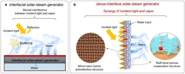 图1. 太阳能蒸汽发生器中蒸汽的形成过程示意图:(a)在传统的界面太阳能蒸汽发生系统中,光在太阳能吸收表面被吸收,同时水蒸汽原位产生,因此入射光将在很大程度上被水蒸气吸收、反射和散射,产生不可避免的能量损失;(b) 在J-SSG系统中,入射光被J-SSG中含有微纳混合抗反射结构的一侧被吸收,水蒸气在具有复杂多级多孔蒸发结构的另一侧产生,因此,水蒸汽和入射光被有效分离,从而减少蒸汽对太阳能的干扰。