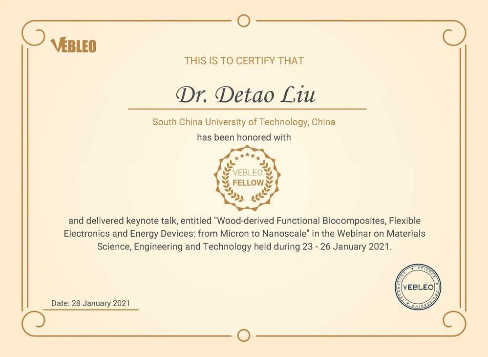 Professor Liu Detao was proundly selected as the Fellow of Vebleo Association, an international scientific organization, in January 23 to 26, 2021. And has been invited to a Webinar on Materials Science, Engineering and Technology hosted by Vebleo, Wood-derived Functional Biocomposites, Flexible Electronics and Energy Devices: From Micron to Nanoscale.