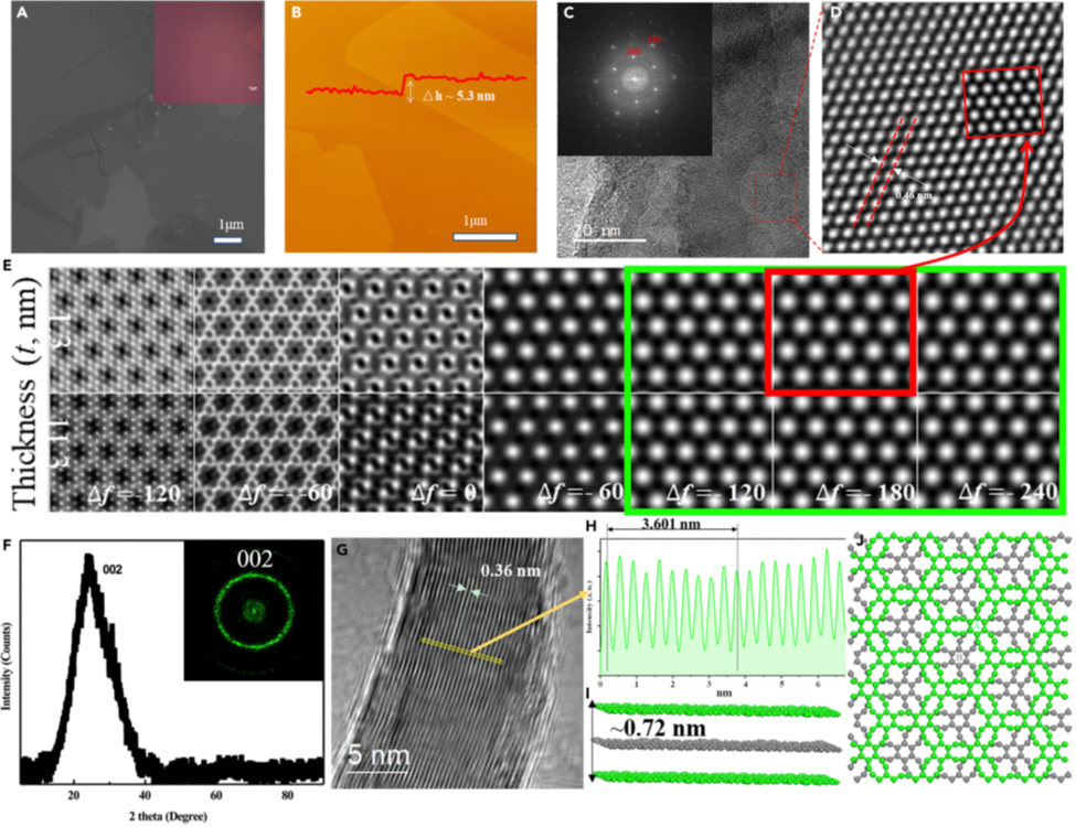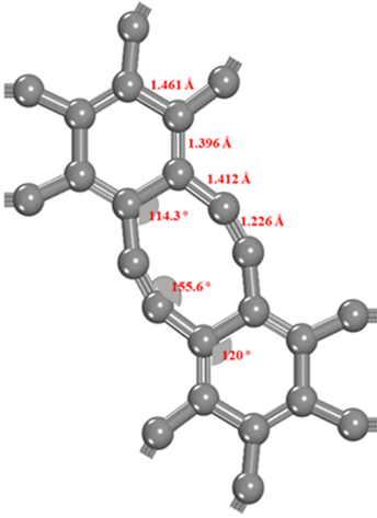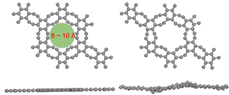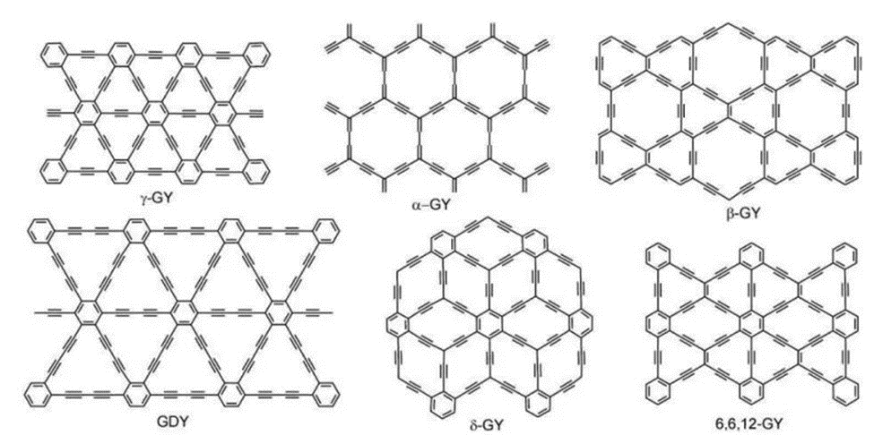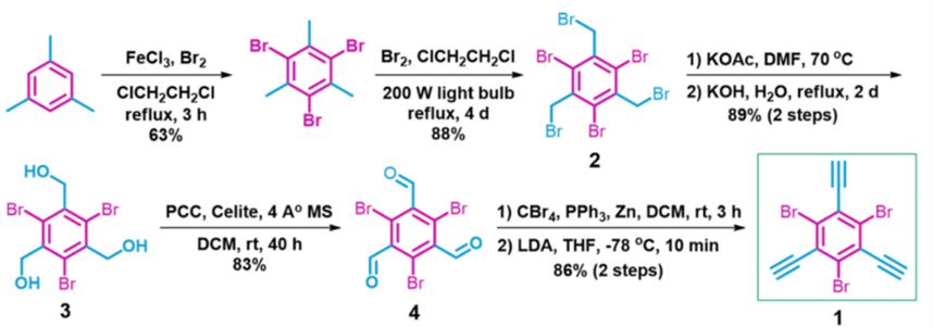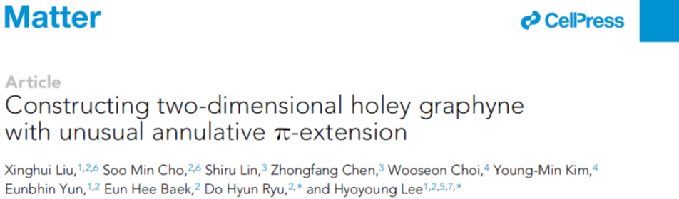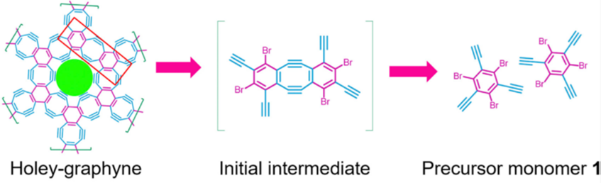 在碳材料的诸位同素异形体中,二维石墨烯无疑是近年来大热的明星分子。(碳的同素异形体。图源:Anil Ohlan,Research Gate)单层石墨烯以其单原子厚度、极佳导热性能、高透明性等性质而倍受研究。然而,单层石墨烯没有带隙(bandgap)。这就限制了其在半导体领域大展身手。迄今已报道,向石墨烯掺杂或给石墨烯造孔,都能产生带隙。相对于掺杂,造孔的方法更加有趣。得益于造孔,我们已经得到了一批新的碳的同素异形体。给石墨烯造孔,特别是大小、分布均匀的孔,绝非易事。无论轰得多么精准,由于每一发炮弹的轰击力度、弹道的偏差,都难以让留下的弹孔大小均一,遑论排列规整。给石墨烯钻孔,“轰击”方法主要包括两种:物理和化学方法。物理方法诸如用等离子体等高能粒子撞击石墨烯,破坏sp2碳网络;无论何种方法,想要获得均一尺寸或均匀分布的孔,难!由于窟窿是砌出来的,所以大小也好,分布也罢,都比较容易做到均匀。用物理或化学手段钻孔,是“自上而下”(top-down);直接用分子、原子构筑孔,是“从下往上”(bottom-up)。当然,这么说很理想。实际上,还要考虑是否有合适的原材料来搭建设计的多孔结构。韩国基础科学研究所Hyoyoung Lee领导的科研团队近期报道了一种从下往上合成多孔二维碳材料的方法。他们设计的是下图左侧所示的一种由乙炔基桥联苯环形成的二维碳网络。由于分子结构中存在碳碳叁键,类似近年来合成的石墨炔结构,作者们将其命名为多孔石墨炔(holey graphyne)。(逆合成分析合成多孔石墨炔所需的前驱体。绿色圆形部分所示为孔。图源:Matter)通过逆合成分析,作者们确定了合成多孔石墨炔的原料——1,3,5-三溴-2,4,6-三乙基苯(前驱体1)。前驱体1可以均三甲苯为原料,经如下一系列步骤合成:(前驱体1,3,5-三溴-2,4,6-三乙基苯的合成方法。图源:Matter)有了原材料后,将其分散在二氯甲烷溶剂中,并将该有机相与含醋酸铜与吡啶(催化剂)的水相接触。在催化剂的催化作用下,前驱体1便在在水-二氯甲烷界面发生炔烃偶联反应,最终交联形成目标产物——多孔石墨炔。所制备的多孔石墨炔尺寸能到微米数量级,与经剥离石墨制备的石墨烯片尺寸相当。高分辨透射电子显微镜显示多孔石墨炔结晶性高,其原子排布方式与石墨烯的六边形网络交错重叠形成的样式非常相似。经仔细模拟与实验测量后,作者们认定,该样式是由于石墨炔单层经AB层叠后形成的。此外,作者们还测定了多孔石墨炔的红外、拉曼、漫反射光谱,计算出该材料的电子结构、载流子迁移率等:可喜的是,多孔石墨炔具有约1.1 eV的直接能隙,是一种优良的半导体材料。多孔石墨炔出现以前,石墨炔已被合成出来,并且俨然已自成一个家族:多孔石墨炔与以上这些石墨炔都具有环绕整个分子的π电子共轭体系,但又“和而不同”。最明显的差异是多孔石墨炔中的碳碳叁键是被掰弯的,而之前报道的石墨炔的碳碳叁键是正常的直线型。(多孔石墨炔晶格结构。中间碳碳叁键发生了明显偏折(155.6°)。图源:Matter)他们通过模拟证实,加热多孔石墨炔到1000 K时,多孔石墨炔只是发生了弯曲,而分子结构并未被破坏。(多孔石墨炔被加热后分子结构发生变形,但整体结构未被破坏。图源:Matter)实际上,通讯作者在采访中表明,他们这项工作的灵感便来源于一种早在1974年就合成出来、具有弯曲碳碳叁键的分子——二苯骈环辛二炔(dibenzocyclooctadiyne)。(dibenzocyclooctadiyne,1974年由Sondheimer及其同事合成)如今,碳的同素异形体家族又迎来了一位新成员。未来将在光电、能量收集、气体分离、催化、水修复、传感器和能源相关领域具有广阔的应用前景。