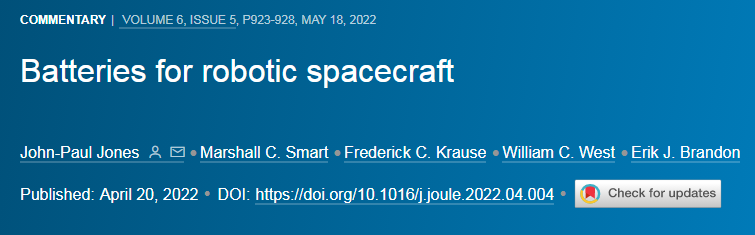 John-Paul Jones, Marshall C. Smart, Frederick C. Krause, William C. West, Erik J. Brandon, Batteries for robotic spacecraft, Joule, 2022, 6(5), 923-928