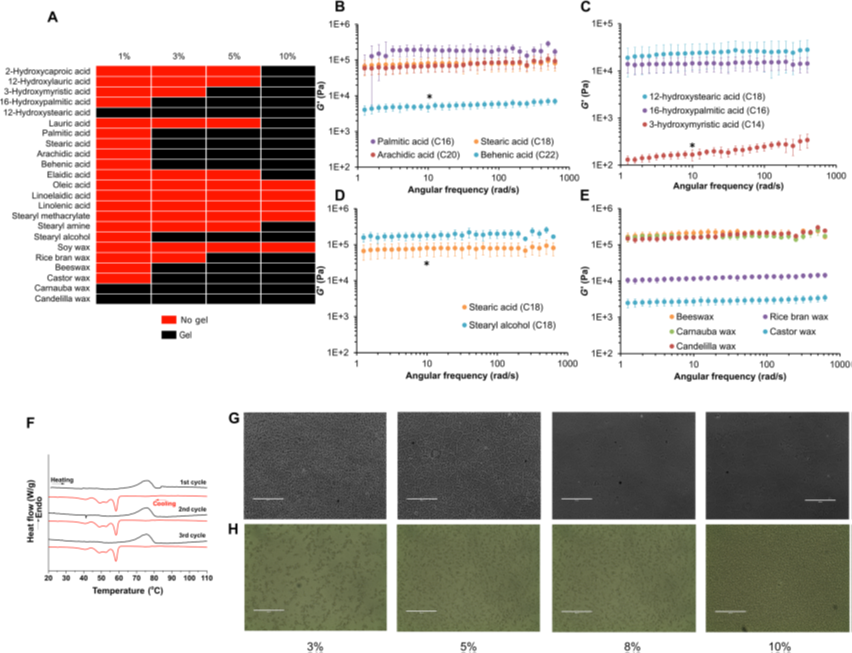 作者首先测试了使用各种长链的饱和脂肪酸合成的油凝胶,然后,作者研究了使用羟基脂肪酸制备的油凝胶的凝胶强度。作者的研究表明,胶凝剂形成膨胀的树枝状微结构以产生油凝胶。通过使用不同的胶凝剂,可以调整这些凝胶的强度以适应消费者的偏好或应用需求。