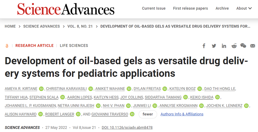 鉴于此,麻省理工学院机械工程系助理教授、哈佛医学院布莱根妇女医院胃肠病学部胃肠病学家Giovanni Traverso团队开发了一种可用于给儿童用药的剂型。作者采用分子料理领域中描述的一种配方技术,将油转化为凝胶,称为油凝胶。油凝胶是由添加到食用油中的胶凝剂制成的油结构体系,通过对疏水系统进行加热、剪切和冷却形成的,从而产生由晶体颗粒、自组装纤维或聚合物包裹液体油的三维网络。该技术已被用于提高油的熔化温度,以使比如巧克力等食品具有耐热性。将植物油转化为凝胶还可以替代动物脂肪以满足饮食限制。此外,使用凝胶代替液体油可以防止油从食品中分离出来,有助于药物的长期储存。相关论文以“Development of oil-based gels as versatile drug delivery systems for pediatric applications”为题,发表在Science Advances上,并被Nature以“Who needs sugar? ‘Oleogels’ help the medicine go down”为题,作为亮点研究报道,这一油凝胶载药体系有助于儿童吞咽药物,解决了父母的一大难题。