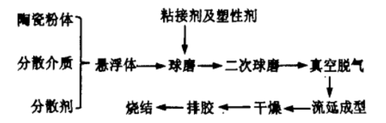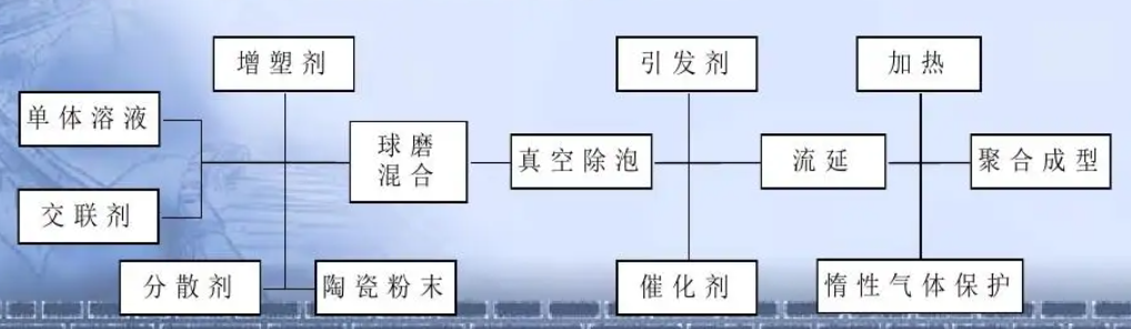 针对水系流延成型存在的问题,研究者提出了将有机单体的聚合原理引入到流延技术中,发明了凝胶流延成型技术,该方法结合了水系和有机流延的特点,在一定温度和保护气氛下在极短时间内固化,极大地降低了浆料量中有机物的使用量,可提高了素坯密度,进而获得近乎无干燥收缩、高质量(表面平整光滑、强度高、韧性好)的陶瓷薄片素坯。