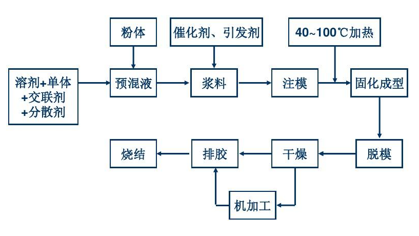 凝胶注模是指将陶瓷粉体分散于含有有机单体、分散剂、引发剂及催化剂的水溶液,注入模具,在一定温度下单体发生原位聚合反应,形成具有一定机械强度素坯的成型方式。
