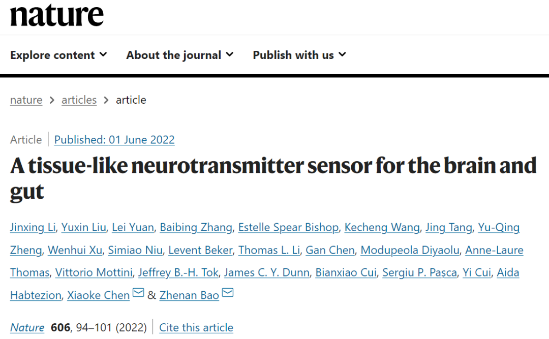 Jinxing Li, et al., A tissue-like neurotransmitter sensor for the brain and gut. Nature 2022, 606, 94-101.