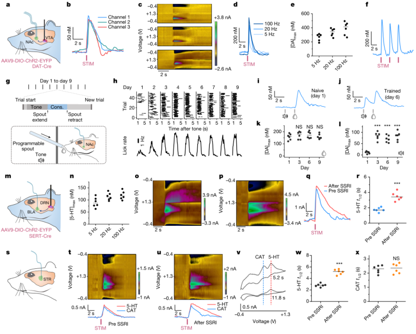 2)电化学分析伏安法。它为临床生物电子学的应用提供了巨大的潜力,因为它普遍适用于未经转基因修饰的野生动物,并已被用于研究人类参与者的单胺动力学。