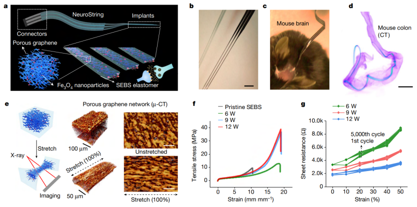 有鉴于此,斯坦福大学鲍哲南院士和陈晓科教授,以及密西根州立大学李金星教授等人通过利用基于石墨烯-弹性体复合材料,发明了一种用于监测单胺神经递质的柔性传感器,并称之为NeuroString,它可以安装在大脑或肠道上,而不会干扰器官的自身功能。