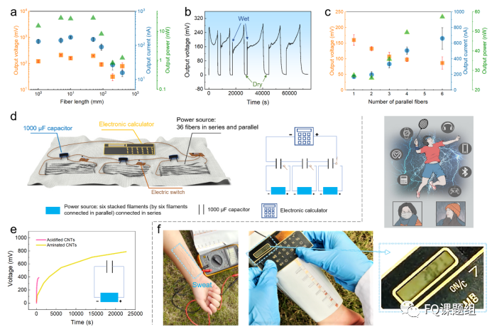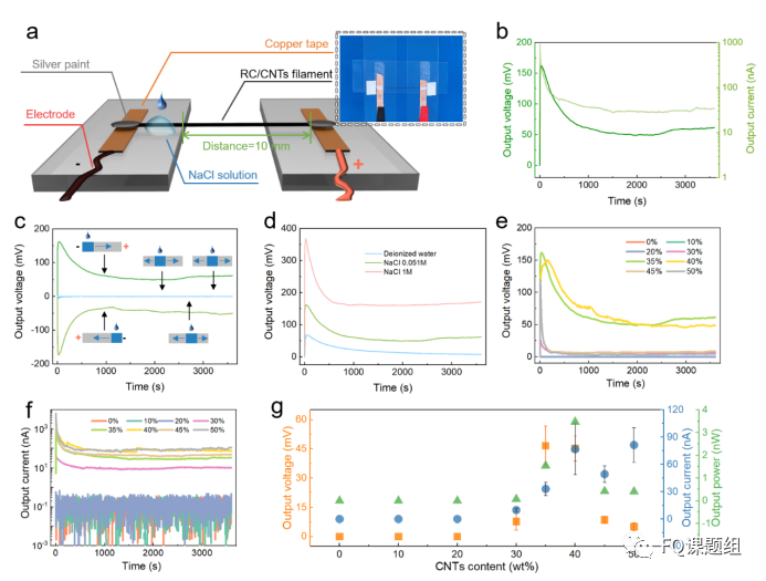 本工作制备了具有柔性的亲水导电的再生纤维素/碳纳米管复合纤维,通过仿照植物的蒸腾过程,得到了汗液蒸腾驱动的湿电纳米发电机。当汗液滴落在纤维一侧时,纤维前端吸收水分,在蒸腾作用下水沿着纤维传输,随后在纤维末端蒸发,从而产生持续流动的水流,诱导动电效应产生了持续的电能。通过改变碳纳米管的含量以及表面官能团种类,得到了发电能力最佳的纤维湿电纳米发电机,此时输出电压160.4 mV,输出电流171.8 nA,体积功率密度0.4 mW cm-3,体积功率密度比大多数传统的纤维湿电纳米发电机高出一个数量级。