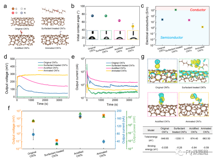 图3 碳纳米管表面改性对纤维发电性能的影响