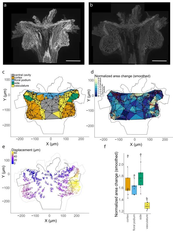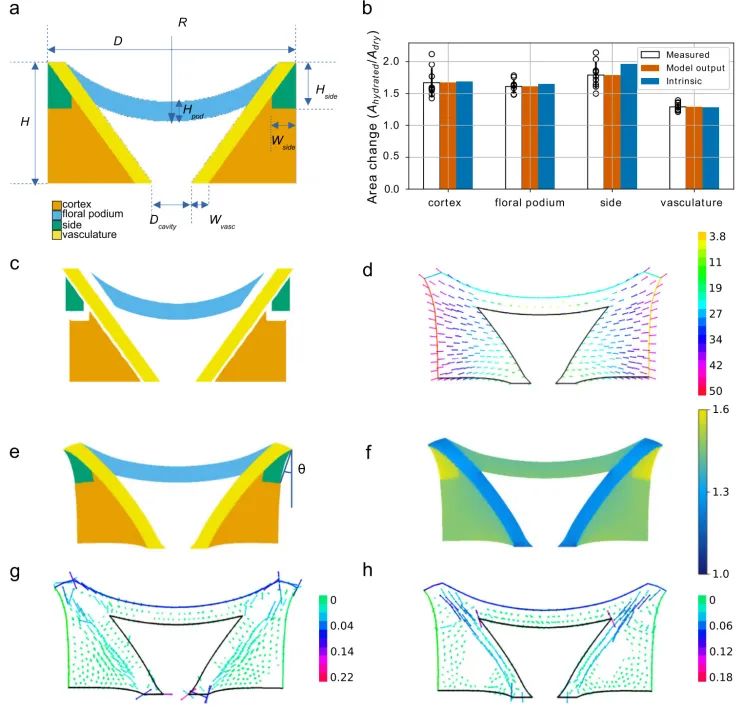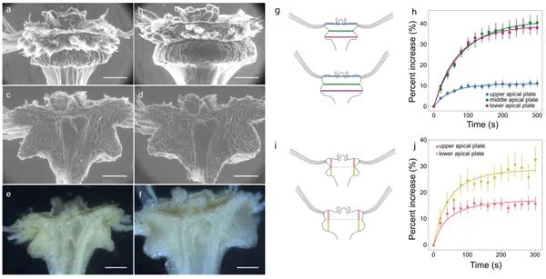 为了研究蒲公英冠毛致动器的吸湿开闭机制,研究人员搭建了一个水合室,通过控制添加到腔室中的水量来控制蒲公英冠毛的开闭程度,发现开合的角度变化范围可达40-100°。而冠毛开合的关键在于根部致动器的不均匀膨胀。研究人员进一步研究发现,蒲公英种子的吸湿致动器源自花萼,主要由花裙座(floral podium)、维管系统、富含脂质的侧面和剩余的皮层细胞四种组织组成。其中冠毛纤维则在上边缘的表皮细胞中伸出,皮质组织排列在维管束和中央腔周围,整体呈现出复杂且精确图案化的径向对称几何形状。在干燥状态下,致动器中大多数细胞收缩堆积在一起,吸湿后不同程度的可逆膨胀可以使上百根冠毛向上和向内聚拢,实现集体运动。