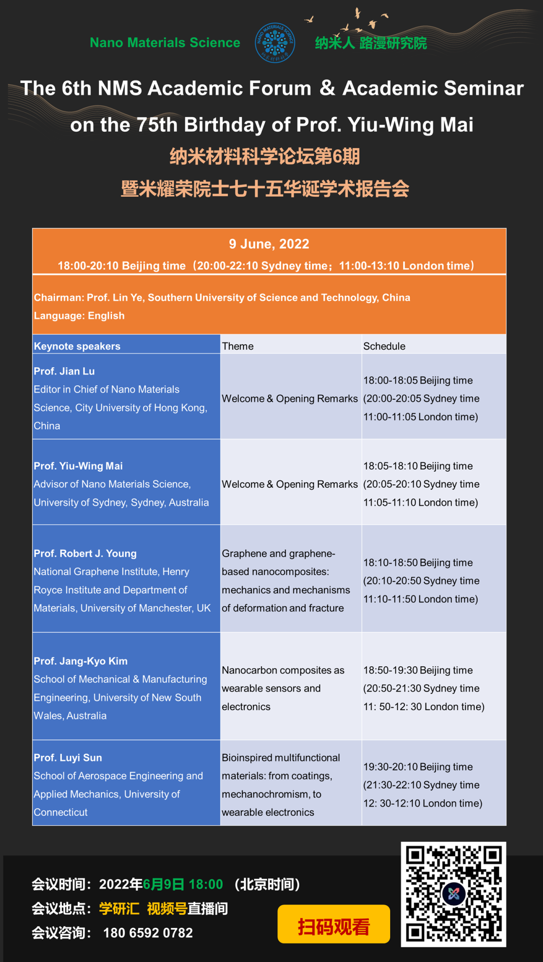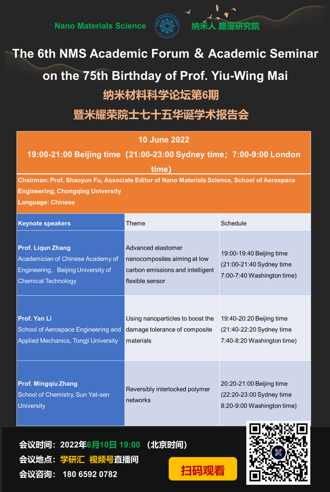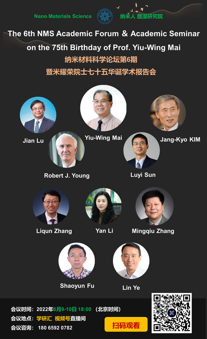 2022年6月9-10日,Nano Materials Science将联合纳米人举办纳米材料科学论坛第6期暨米耀荣院士七十五华诞学术报告会(线上会议)。本次会议将邀请吕坚院士和Yiu-Wing Mai (米耀荣)院士致开幕辞,付绍云教授和叶林院士作主持人,曼彻斯特大学Robert J Young院士、新南威尔士大学Jang-Kyo Kim院士、美国康涅狄格大学孙陆逸教授,北京化工大学张立群院士、同济大学李岩教授、中山大学章明秋教授做主题报告,欢迎大家参加。