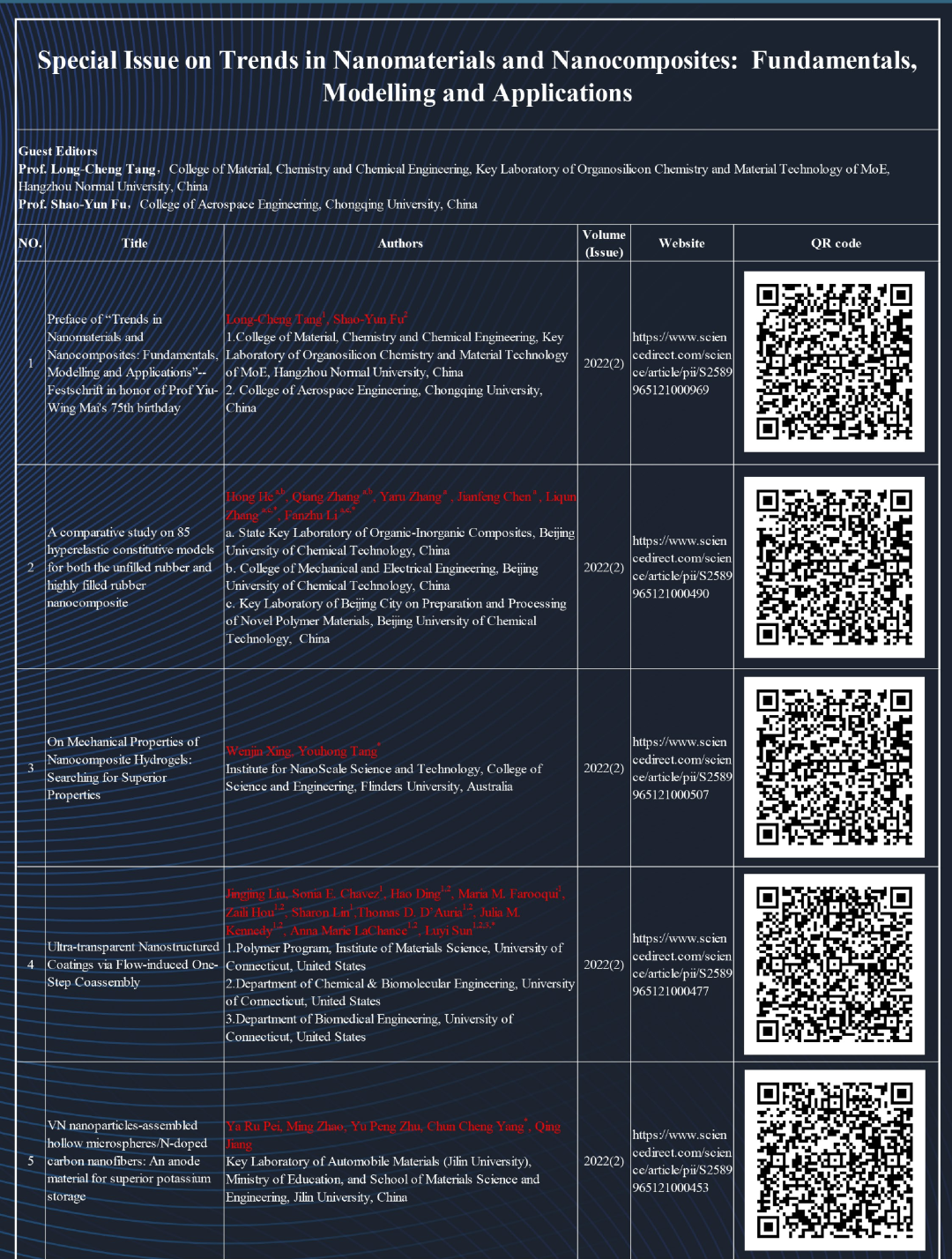 Special Issue: Trends in Nanomaterials and Nanocomposites: Fundamentals, Modelling and Applications (Guest Editors: Long-Cheng Tang and Shaoyun Fu), Nano Mater. Sci.