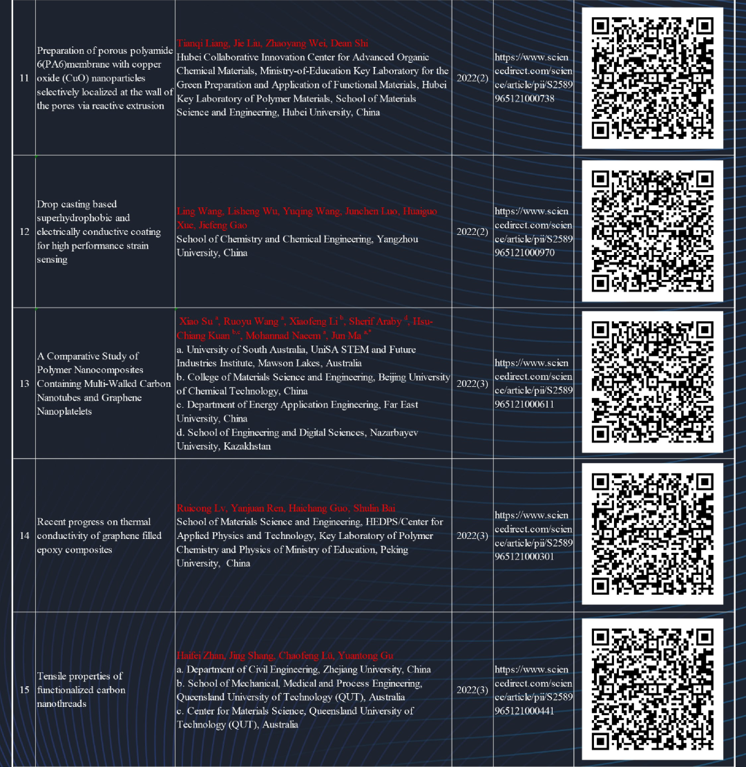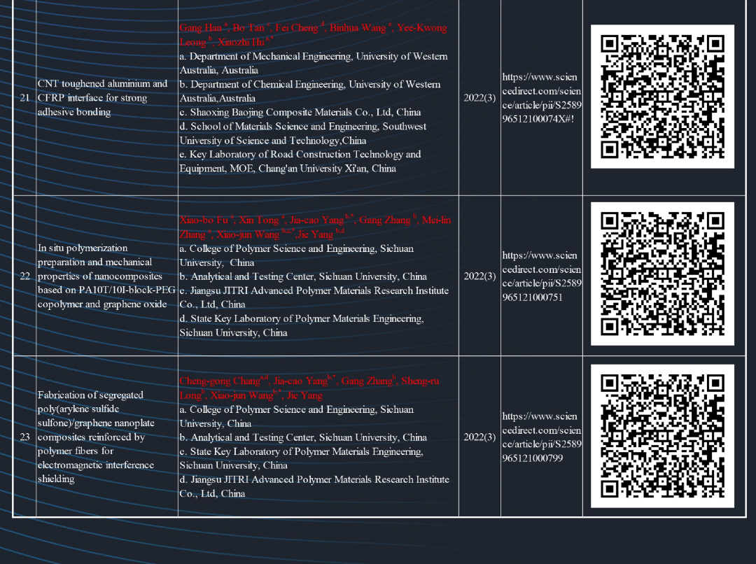 成果已被93个国家的学者及661种SCIE期刊引用报道,总下载45万余次。2021年期刊指标CiteScore为14.2,模拟影响因子为10.742。已入选EI、CSCD核心、Scopus、CAS、DOAJ、INSPEC数据库,获评为中国高质量科技期刊分级目录的材料科学综合类T2级、中国高校优秀科技期刊、重庆市高品质科技期刊、重庆市出版专项资助期刊、重庆名刊。