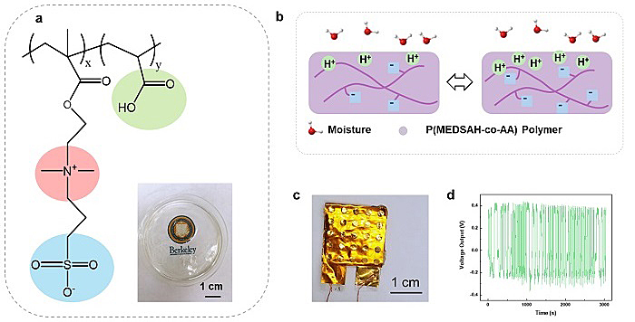 在过去的几十年里,绿色和可再生能源已经成为传统化石能源的重要补充。一种新的基于质子传输、离子传输或电动反应机制的湿度-发电效应也可以用于构建能量收集器件,利用外界湿度产生电能。然而这些器件的持续运行时间段通常是间歇性和短暂的,通常需要不断吸水/脱水循环。为解决这一问题,加州大学伯克利分校林立伟教授与澳门大学钟俊文教授合作,开发了一种可在相对稳定湿度条件下长时间工作并兼具高能量密度的湿度发电机。该研究描述了Poly([2-(methacryloyloxy)ethyl] dimethyl-(3-sulfopropyl) ammonium hydroxide-co-acrylic acid)聚合物凝胶中由水分引起的电位自主振荡的独特现象:当暴露于一定程度的水分时,聚合物凝胶的表面电位将发生振荡并产生交流电输出,可以产生峰值0.4 V的交流电压。