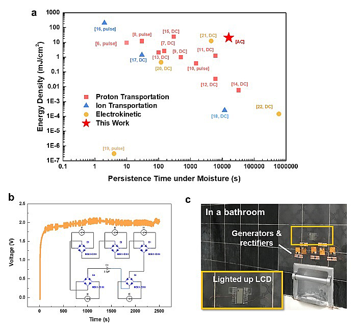 该研究报道的交流式湿度发电机在单次水分激活的情况下能持续工作超过15000秒,发电的能量密度为16.8 mJ/cm2,综合发电能力由于大部分已报道的湿度发电机。此外,将5个发电机串联连接并放置于浴室中可产生 2 伏输出电压,点亮液晶显示器。