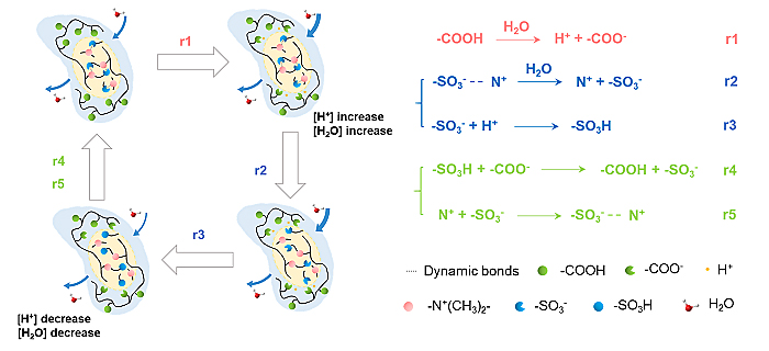 图2. Poly([2-(methacryloyloxy)ethyl] dimethyl-(3-sulfopropyl) ammonium hydroxide-co-acrylic acid)聚合物凝胶表面电位振荡的化学反应循环。