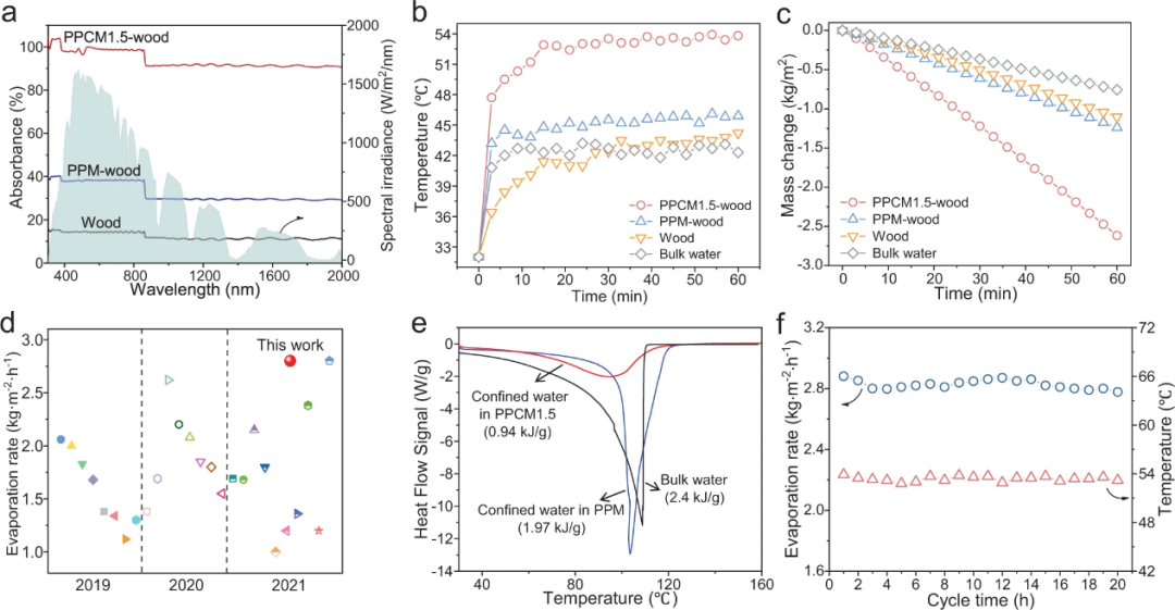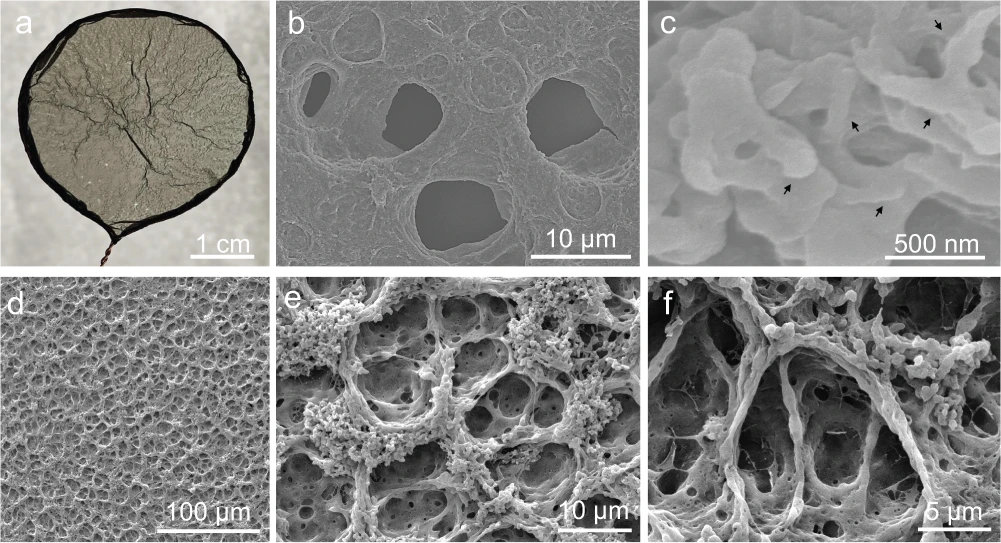 不混溶液体之间的界面可以在化学和工程中起着至关重要的作用。一个经典的例子就是油和水界面上的铺展现象——具有比水表面张力更小和更低密度的,且与水不混溶的分散溶剂,可以在水的表面快速铺展开。这种现象可以被用于制备薄膜、超材料等尖端材料。相比之下,水或与水混溶的溶剂会在水中快速混合,从而阻碍稳定界面的形成和溶剂在水中的扩散。而在生物体中,水几乎是唯一的溶剂。数百万年的进化赋予生物体操纵水-水界面的有趣能力。以皮肤为例,流体透明角蛋白颗粒在其向上到达皮肤表面的过程中经历pH响应相变,最终在最外层形成角质层。这暗示水溶性聚合物之间的刺激依赖性相互作用对于稳定两种聚合物水溶液之间的水-水动态界面是可行的。受皮肤启发,华中科技大学的赵强教授团队实现了聚电解质溶液自发地在水-水界面上的铺展(SWOW)。通过制备含有聚乙烯亚胺(PEI)和聚苯乙烯磺酸钠(PSSNa)的混合溶液,其中,PSSNa 赋予混合物溶液低于水的表面张力,这是表面铺展的驱动力。同时,PEI是一种在酸性条件下带正电荷的弱聚电解质,可提供pH响应络合。PEI-PSSNa溶液的液滴可以在酸性水中自发铺展,形成分层多孔膜,且无需表面活性剂或精密设备。该技术适用于各种聚电解质和纳米材料,扩大了表面铺展可及的功能材料的范围。作为概念验证,这些多孔膜在单次太阳照射下显示出良好的太阳热蒸发性能(2.8 kg/m2 h)。相关工作以“Spontaneous water-on-water spreading of polyelectrolyte membranes inspired by skin formation”发表在《Nature Communications》。在皮肤的形成过程中,流体蛋白质颗粒在朝向皮肤表面运动的过程中经历由pH值降低(7.4至5.5)和蛋白质络合共同驱动的扩散和固化。受此启发,研究者将两种商业聚电解质,即PEI和PSSNa溶解在水(pH 13)中以制备均匀混合物。PEI 中胺基的质子化在pH 13时较低,导致PEI-PSSNa络合较弱。这使得PEI-PSSNa溶液液滴可以自发地铺展在水(pH 2.25)表面,并在约2秒内形成PEI-PSSNa膜(PPM2.25)。在SWOW铺展的过程中,PEI-PSSNa溶液中的胺基在酸性条件下被质子化,PEI-PSSNa发生静电络合并会导致相分离,使得PPM2.25形成独立支撑的薄膜。通过使用冷冻电镜来观察PPM薄膜的结构,所有PPM的顶表面(与空气接触)相较于底表面(与水接触)更粗糙且多孔。进一步证明了络合反应会产生一层薄薄的水不溶性聚电解质络合物(PEC),可稳定瞬时水-水界面。而随着时间的增加,络合逐渐向上发展,导致了相转变和并形成微孔。这为构筑非对称孔的薄膜提供了一种新的思路。将一滴PEI-PSSNa溶液置于酸性水面上会发生三个过程:(1)由表面张力驱动的表面铺展、(2)水-水混合以及(3)pH导致的PEI-PSSNa络合。水(γw)和PEI-PSSNa溶液(γs)之间的表面张力差(Δγ)代表SWOW扩散的驱动力。PEI-PSSNa界面络合是由底层水的较低pH值触发的。当水的pH值越低,络合(Kc) 越强,因为PEI的质子化与下层水的酸度呈正相关。PEI-PSSNa络合导致溶液到固体的转变,从而限制溶液的扩散和混合。因此,PPM的最大直径(Dmax )与Δγ成正比,与 K c成反比Δγ。其中γs为60 mN/m,而γw稳定在75 mN/m,因此Δγ相对于pH值是稳定的。随着水的pH值(pH > 2.5)的进一步增加,PEI-PSSNa络合太弱而无法触发液固相变,并且没有形成固体膜。随着溶液pH值降至1.25以下,络合又非常强,以至于PEI-PSSNa溶液液滴立即凝固在酸性水的表面,即非常小的Dmax。此外,当通过在水中添加表面活性剂来调整γw时,观察到类似的Dmax与Δγ相关性。SWOW机制适用于由盐和溶剂交换触发的不同刺激响应性聚电解质络合系统。将少量碳纳米管(CNT)分散在PEI-PSSNa溶液中,将其铺展在酸性水中以形成 PEI-PSSNa-CNT杂化膜(PPCM),并选择厚度相对较大的PPCM1.5进行光热蒸发研究。与PPM相比,添加适量的CNT不会显着改变PEI-PSSNa-CNT混合物的SWOW铺展过程,而PPCM1.5的高孔隙率有利于太阳能热应用。研究者将PPCM1.5沉积在天然木材的表面以构建双层太阳能蒸发器(命名为 PPCM1.5-wood)。经过单日辐照下PPCM1.5-wood的蒸发率为2.8 kg/m2 h,显着高于PPM-wood (1.3 kg/m2 h)、木材 (1.1 kg/m2 h)、空对照组(0.8 kg/m2 h) 。这表明PPCM1.5-wood的蒸发率是太阳能蒸发器中的顶级值之一。其高蒸发率与PPCM1.5-wood的蒸发焓降低有关。PPCM1.5-wood中的水蒸发焓通过差示扫描量热仪测量为0.94 kJ/g,与散装水(2.4 kJ/g)相比降低了61%。图5 SWOW制备的PEI-PSSNa-CNT膜。总结:与经典的油-水铺展相比,水对水铺展在材料工程和化学合成方面的开发较少。受皮肤形成机制的启发,研究者提出了一种无需专门设备即可实现常规大小水滴 SWOW的铺展。PEI-PSSNa溶液的表面张力( γs=60 mN/m)比水小,这为表面铺展提供了驱动力(Δ γ )。当溶液液滴置于酸性水中时,由于酸性水中胺基的质子化,导致了PEI-PSSNa的络合,产生相分离,最终制备出独立支撑的薄膜。SWOW机制简单且通用,适用于常规尺寸的液滴和水溶性聚合物。作为概念验证,在环境条件下制备了掺入碳纳米管的混合膜,其具有促进有效太阳能吸收和能量转换的分层孔隙,例如,PPCM1.5的太阳能热蒸发率为2.8 kg/m2 h(一日辐照下)。