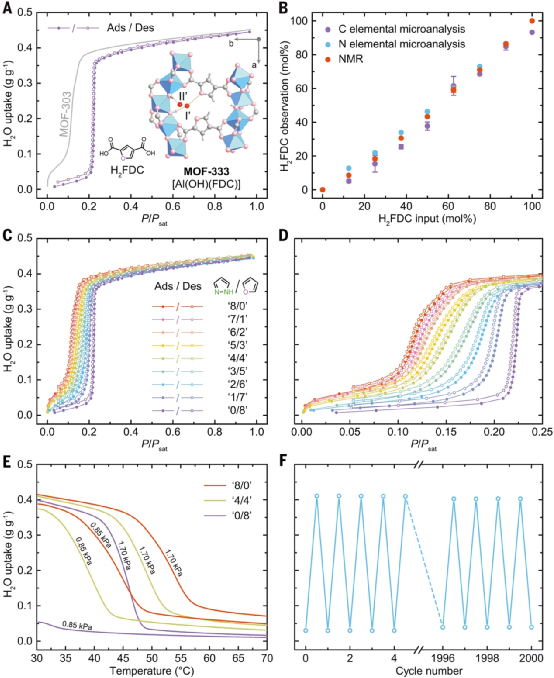 通过将“4/4”暴露于 1.7 kPa 的水蒸气压并在 30°-85°C温度之间进行循环,在一个 MOF 晶体中混合 PZDC2– 和 FDC2– 不会损害单一链接框架的水解稳定性——这是一项可靠地验证 MOF 寿命的测试。填充这些位置的分子顺序为:第一个水分子与极性有机连接分子紧密结合,然后再吸收水分子形成孤立的水团簇,然后是通过团簇形成链结构,最后是水网络。在 2000 次吸收和释放循环后,吸附剂保留了约 97% 的原始工作容量。