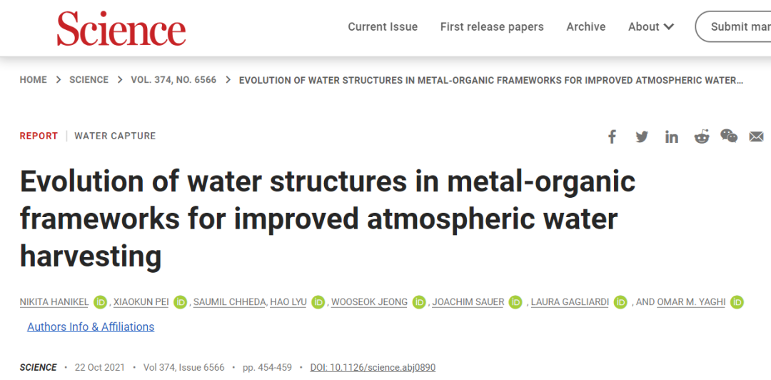 Nikita Hanikel et al.Evolution of water structures in metal-organic frameworks for improved atmospheric water harvesting.Science 374, 2021, 454-459.