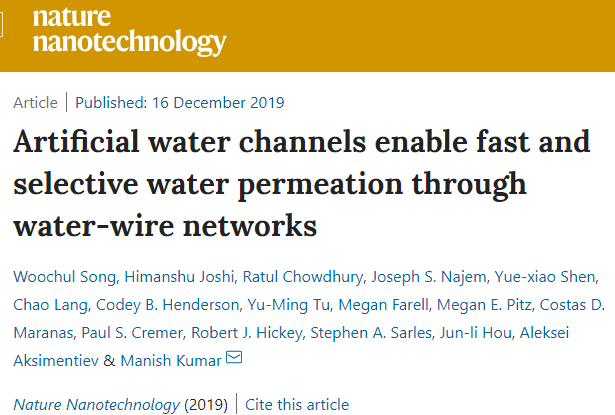 Woochul Song, Manish Kumar*, et al. Artificial water channelsenable fast and selective water permeation through water-wirenetworks. Nat. Nanotech., 2019