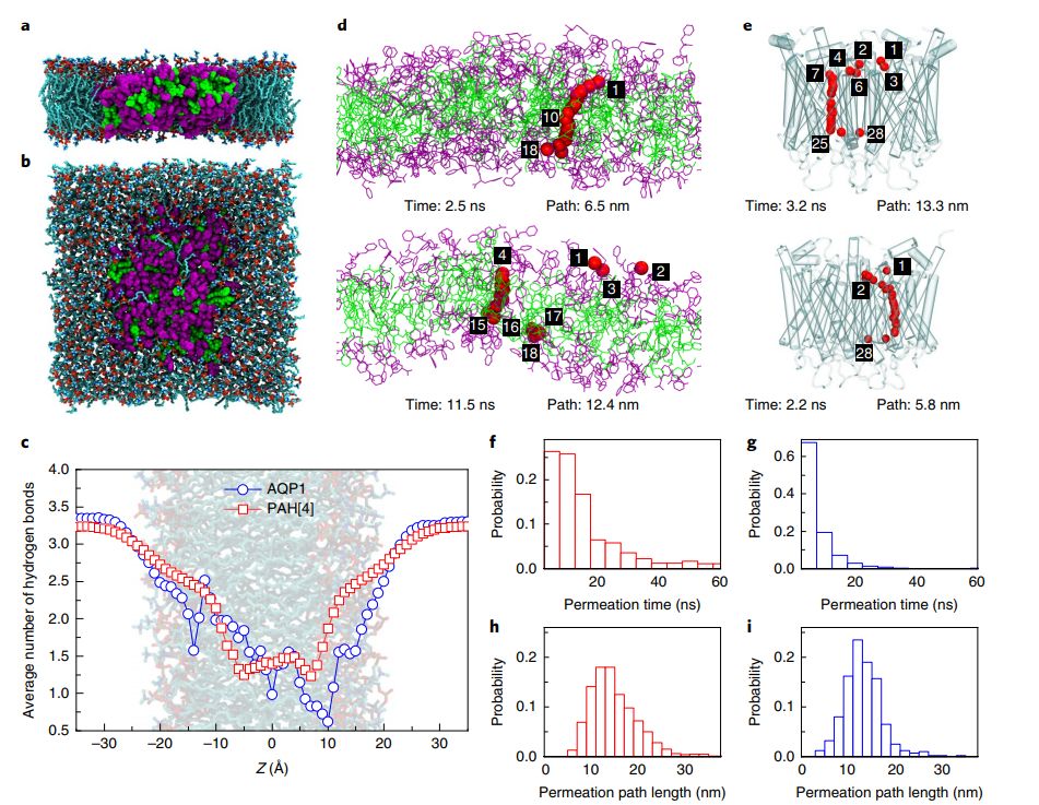 要点1. 荧光实验和模拟表明,PAH [4]可以通过横向扩散在脂质膜中形成簇,从而提供协同跨膜路径,以通过水线网络快速选择性地渗透水。定量运输研究表明,PAH[4]s每秒每分子可运输>10E9个水分子,这与水通道蛋白水通道相当。这些通道的性能超出了当前脱盐膜的上限约4个数量级。