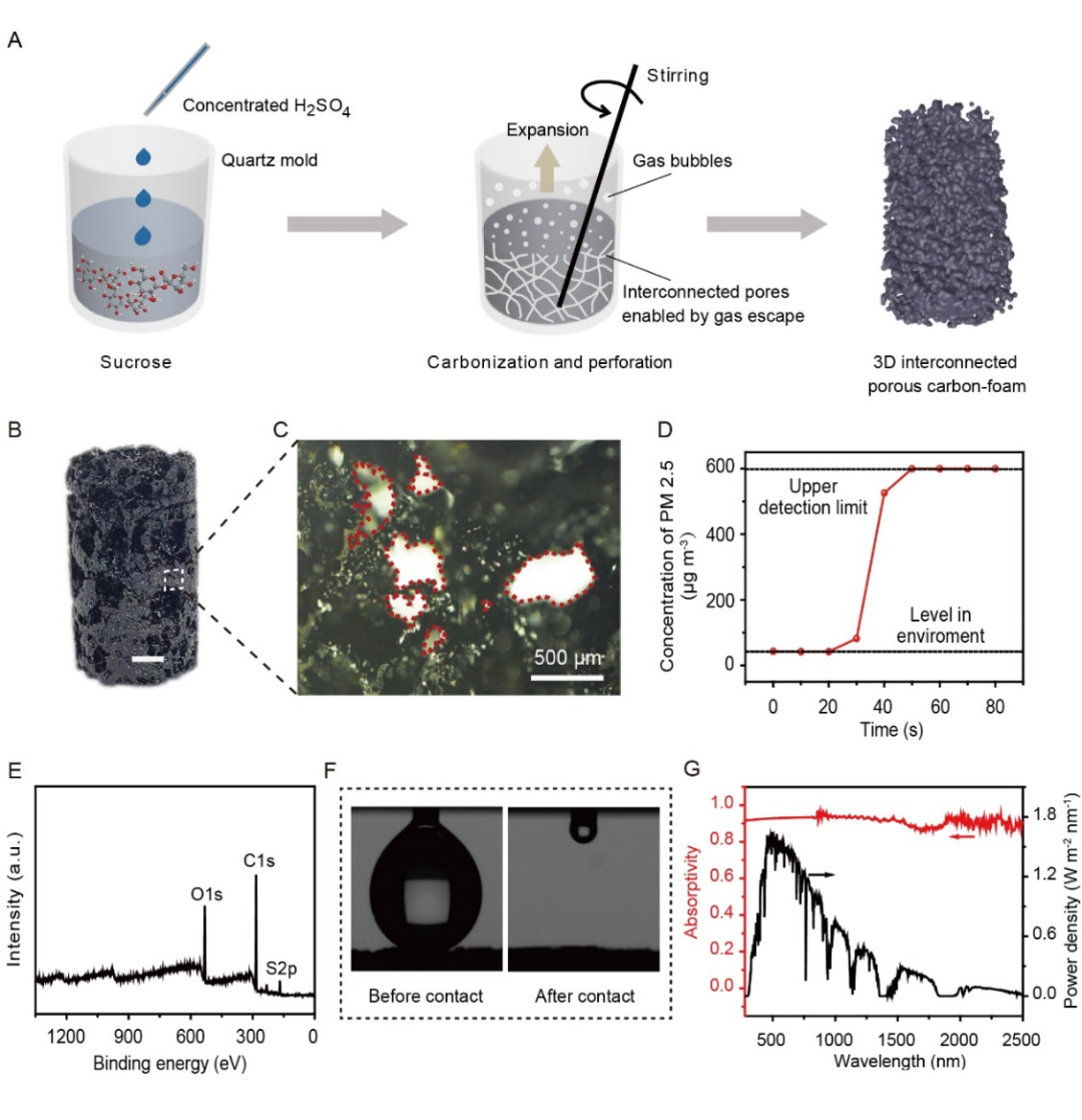图2.(A)3D IPCF的制备过程。浓硫酸将蔗糖碳化,产生的气体会导致独特的膨胀和穿孔。(B)3D IPCF的光学照片。比例尺为1cm。(C)3D IPCF的光学显微镜照片。相互连通的孔的尺寸在几十微米到几个毫米。(D)PM2.5能够穿过3D IPCF,证明了它具有连通的孔道供气体分子穿过。(E)3D IPCF的XPS能谱表明它由碳、氧和氮元素组成。(F)3D IPCF的接触角测试表明其具有超亲水特性,因为水滴迅速的渗入到了体内。(G)3D IPCF的吸收光谱。