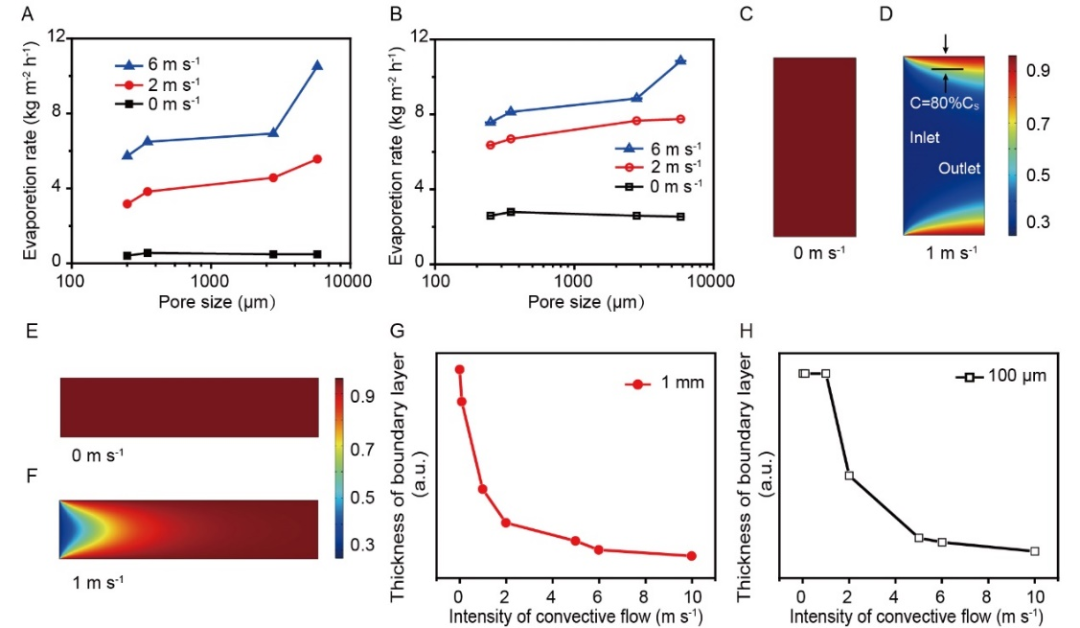 随后作者通过理论模型对蒸发速率随孔径变化的微观机制进行了研究。这个模型讨论了两个具有代表性的孔道直径,分别是1 mm和100μm(孔道长度皆为400μm)。对流流动从左边进入这些一维微孔道。孔道的上下壁面为蒸发表面。正如图3C和3D所示,对于1 mm的孔径,在轻微的对流作用下,上下蒸发壁面蒸发出的水蒸气浓度场从严重的相互干扰(不利于水蒸气扩散)变为了完全不相互干扰(水蒸气充分扩散)。但是,对于小孔径孔道(100μm),在相同的对流作用下,两个壁面蒸发出的水蒸气的浓度场干扰一直存在,预示着水蒸气难以扩散(图3E和3F)。为了定量反映水蒸气的扩散程度,以及蒸发表面与对流之间的热与物质的交换,作者定义了边界层厚度,即蒸发孔道壁面与水蒸气浓度下降到饱和蒸汽浓度的80%处(如图3D所示)。由图3G和3H可知,相比于小孔径孔道,大孔径孔道的边界层厚度随对流强度的增加下降的更快,预示着在大孔径中水蒸气的扩散更为有效。这些结果与之前的实验结果相符合。