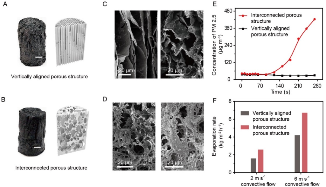图4.(A和B)具有垂孔道和相互连通管孔道的多孔结构(更优)被用作对比。左侧是光学照片,右侧是示意图,比例尺为1 cm。(C 和D) 两种多孔结构的SEM图。左侧是截面图,右侧是俯视图。(E)两种结构的PM2.5通过行为测试。(F)两种结构的蒸发速率。相互连通孔结构比垂直孔道结构蒸发速率快。