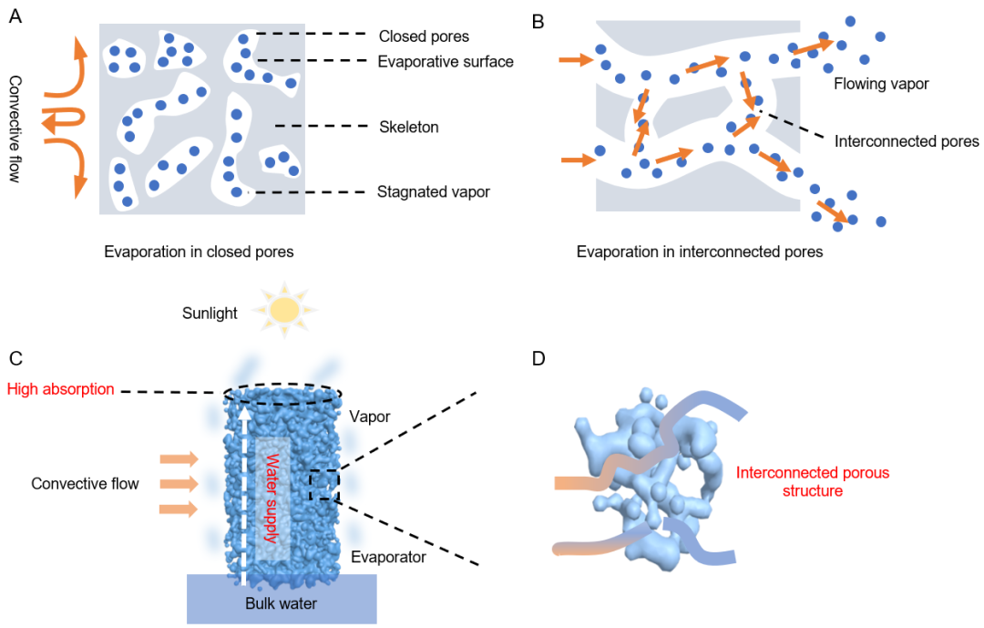 传统多孔蒸发器蒸发过程的详细研究发现蒸发速率是由相变和扩散两个连续的步骤共同决定的。第一步是相变过程,水分子从蒸发器表面蒸发出来变成水蒸气;第二步是扩散过程,水蒸气从多孔结构扩散到大气环境中。之前的大部分研究都集中在增加多孔蒸发器的蒸发表面,以最大限度地实现第一步的相变过程。然而,在传统的多孔蒸发器中,如果是封闭的多孔结构,蒸发的第二步扩散通常会不充分,大量的蒸汽被限制在孔隙中扩散出不去,从而限制了蒸发速率(图1A)。
