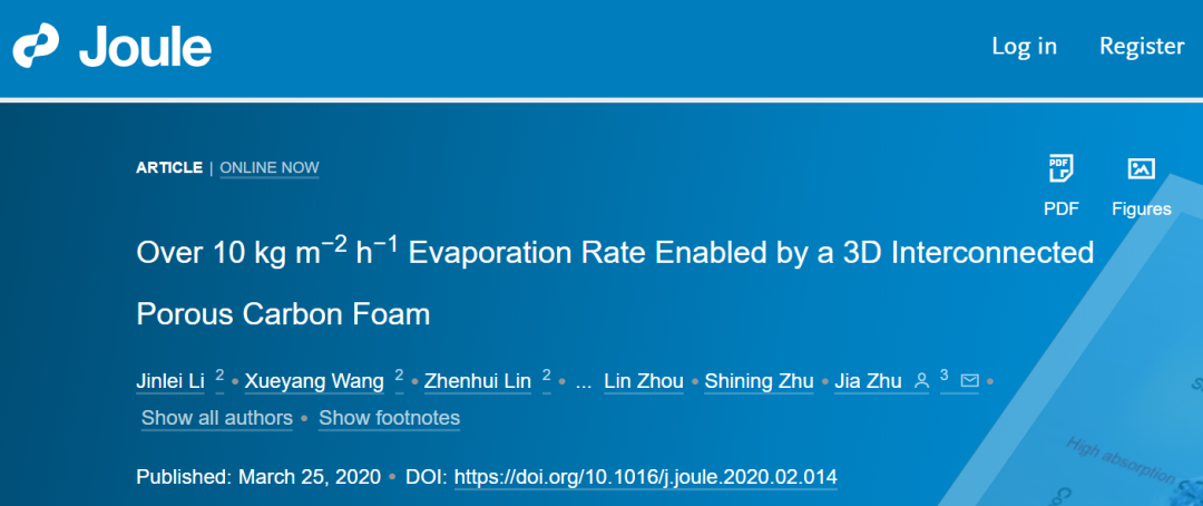 Over 10 kg m-2 h-1evaporation rate enabled by a 3D interconnected porous carbon-foam, Joule, 2020