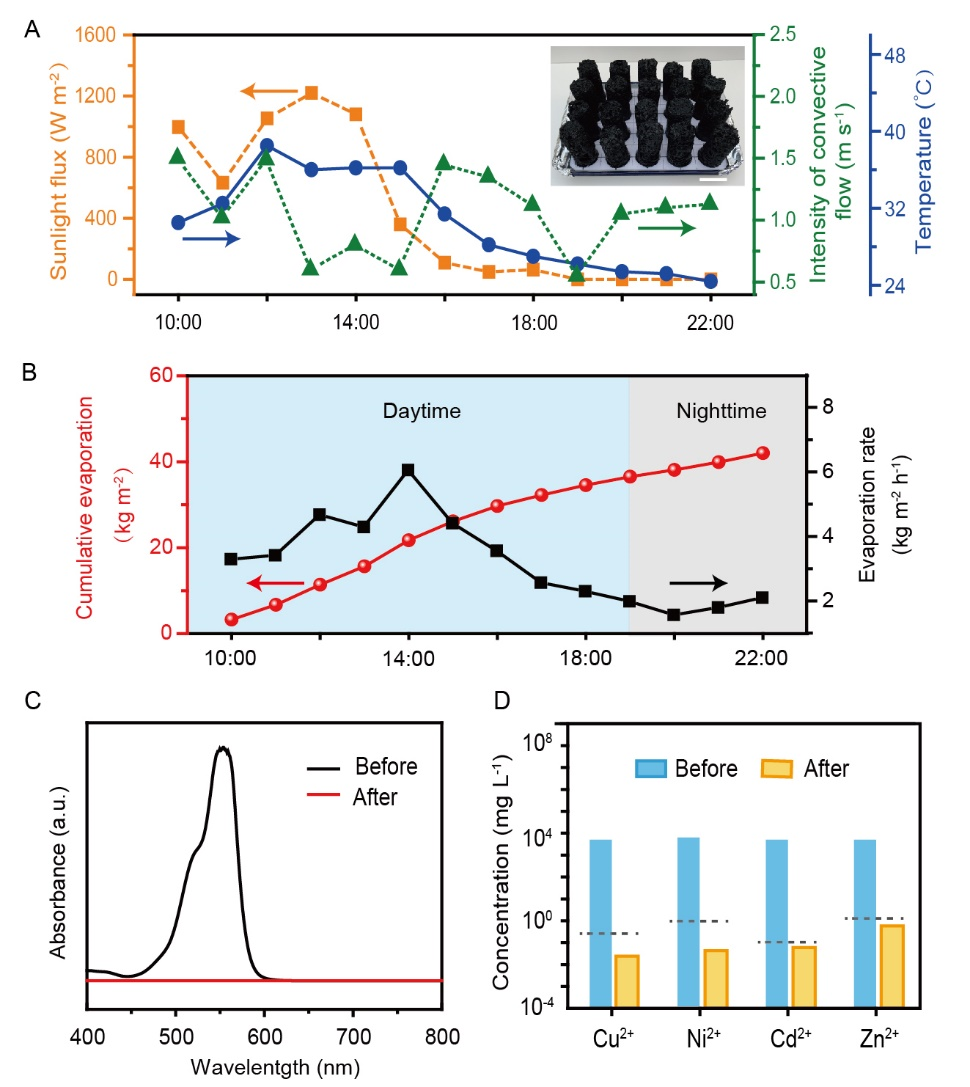 图5.(A)户外实验的条件。插图展示了大规模装置的照片,比例尺是5 cm。(B)连续13小时的蒸发性能。在对流的作用下,3D IPCF可以在白天和晚上都蒸发水。(C和D)3D IPCF应用在污水处理领域。在处理被染料分子和重金属离子污染的水样后,水质达到环保部门的要求。