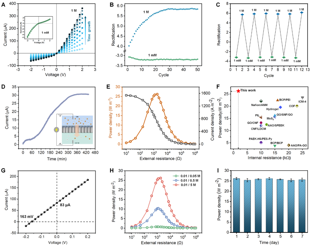图3 三明治膜对高盐环境的动态自适应过程及其在盐差发电中的应用。(A)高盐度下,三明治膜的跨膜离子电流随扫描时间逐渐增大,而低盐度下保持恒定;(B)高盐度下,整流比不断增大,而低盐度下整流比几乎保持不变;(C)膜性能在高低盐度变化下的可逆性;(D)盐差发电电流随时间增长而不断上升;(E)三明治膜的发电电流和功率,输出功率密度在电阻为 1.8 kΩ 时达到最大值 26.22 W/m2;(F)功率与已发表文献的对比;(G)50倍盐度梯度下膜的 I-V 曲线;(H)不同盐度梯度下膜的发功率密度;(I)500倍梯度下发电性能的长期稳定性。