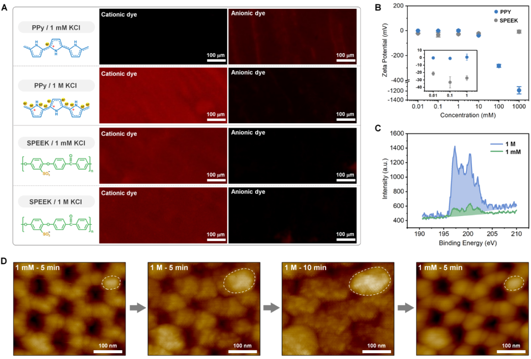 图2 盐度变化引起的聚吡咯侧表面化学和物理性质变化。(A)带正/负电荷的荧光染料对膜进行染色的荧光图像;(B)不同盐浓度下膜的 Zeta 电位;(C)不通盐浓度下聚吡咯的XPS 分析;(D)不同盐度下聚吡咯的原位AFM表征。