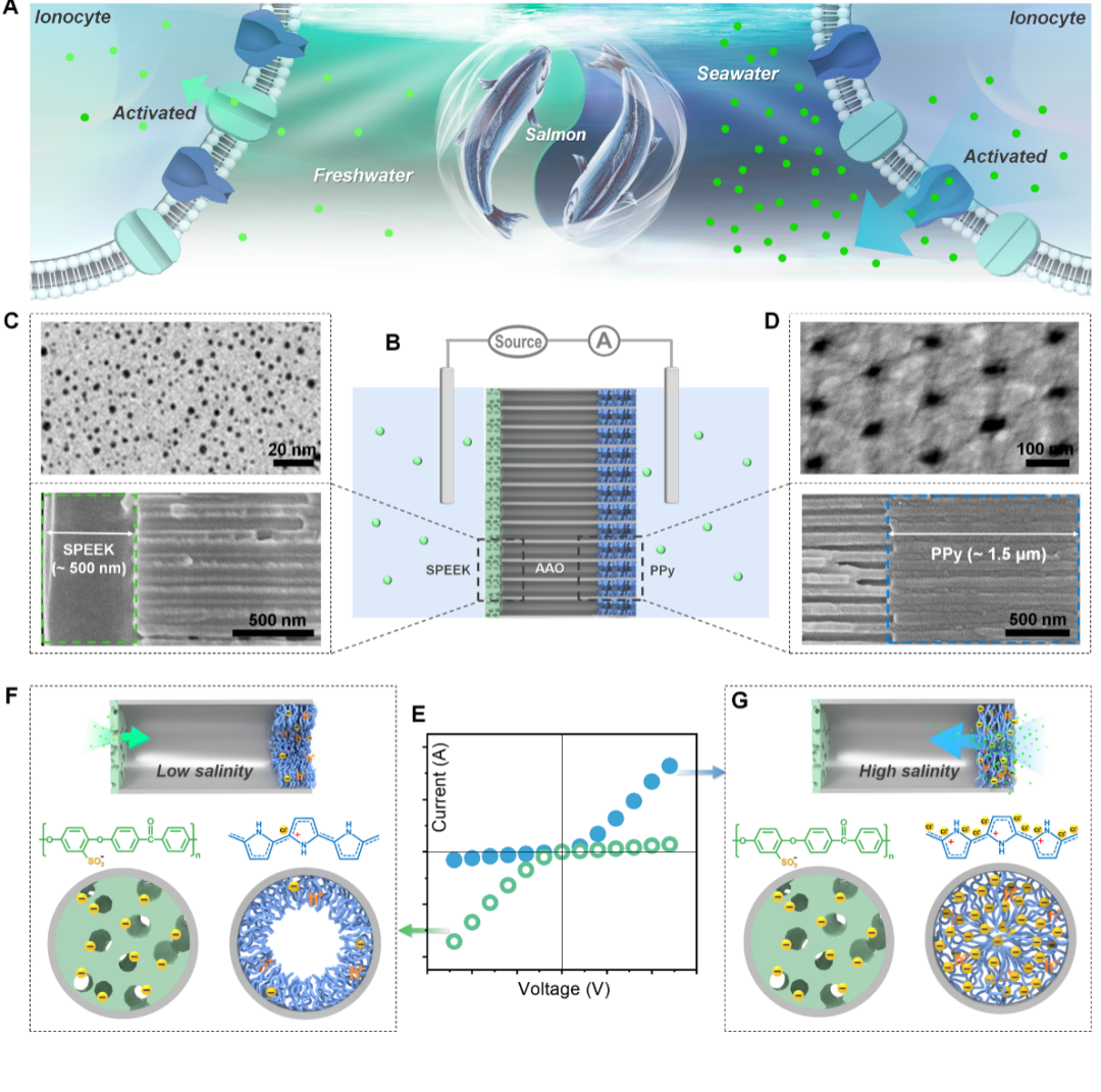 图1受三文鱼启发的盐度自适应型纳米流体二极管的示意图。(A) 广盐性鱼类通过生物离子通道吸收或释放离子以调节渗透压;(B) 基于SPEEK/AAO/PPy三明治结构膜的离子二极管示意图;(C,D)三明治结构纳米通道的电镜表征;(E) 盐度自适应型纳米流体二极管的整流方向可随浓度发生逆转。(F,G)纳米通道对不同盐度的自适应调节示意图。