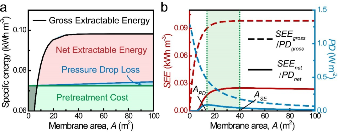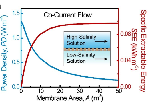 本文对NPG的实际可行性进行了系统的评估。首先,我们分析了实验室内小型NPG的性能,结果表明,无论所用材料的性能有多么的优越,其功率密度都会受到浓差极化现象的限制。然后,我们分析了工程应用中大型NPG的性能,发现其功率密度随其尺寸的增大会进一步减小,同时,其能量密度也较低。最后,我们发现,考虑到运行过程中的能量损耗(包括预处理能耗与泵的能耗),NPG的净功率密度和净能量密度非常小。因此,我们认为利用NPG进行盐差发电并不具备实际的可行性。