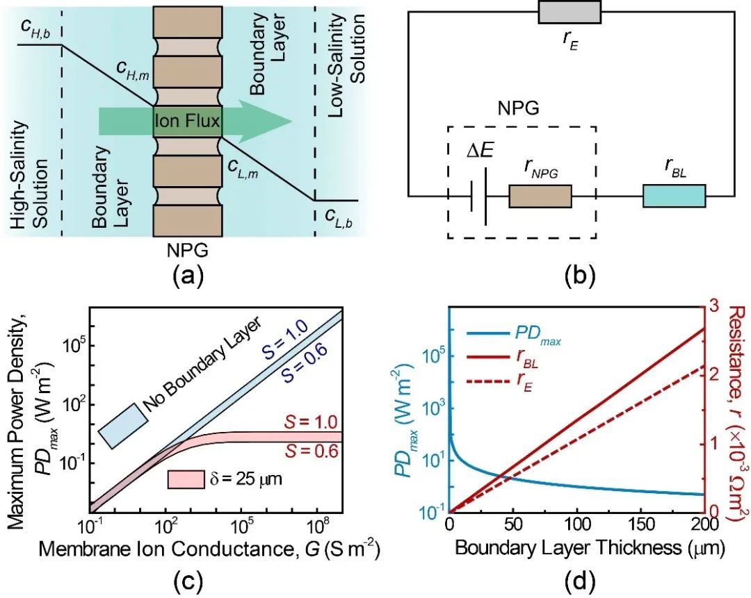在理想情况下,NPG的功率密度与材料的导电率呈线性关系(图2c蓝色区域)。然而,在实际操作中,由于流体边界层的存在,浓差极化现象不可避免,而浓差极化会使得NPG膜两侧的浓度差显著降低,进而极大地降低NPG的功率密度(图2a)。根据图2c(红色区域),当材料的导电率增加到了一定程度,NPG的功率密度就无法继续提升,其最大的功率密度随浓差极化边界层的增大而降低(图2d)。因此,无论材料的性能有多么的优越,NPG的功率密度都会受到浓差极化现象的极大限制。