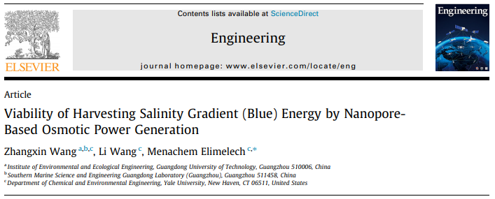 中国工程院院刊Engineering | 广工大王樟新团队、耶鲁大学Elimelech团队:基于纳米孔的盐差发电技术的可行性