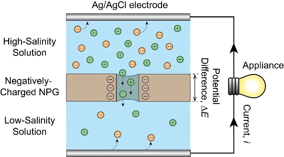 纳米孔道内带负电的NPG膜将高浓度和低浓度的溶液分隔开。在浓度梯度的作用下,阳离子会跨NPG膜进行传递,而阴离子的跨膜传递会因电荷效应而被阻碍。由于阴阳离子的选择性传递,NPG膜两侧就会形成电势差。在NPG膜两侧放置两个Ag/AgCl参比电极即可构建一个闭合电路,产生电流,暨盐差发电。