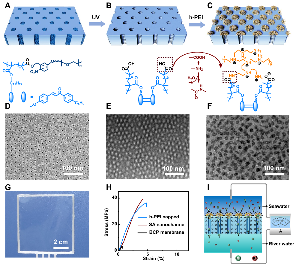 在河流入海口,由于海水和河水浓度差存在着盐差能,作为一种储量丰富的可再生清洁能源,有望缓解化石能源带来的环境污染,全球变暖等问题。基于离子选择性的膜的反电渗析电池是实现盐差能转换为化学能的最有前景方式。但是作为其中的核心部件——离子选择性膜存在着离子通量小,无法实现盐差能的高密度转换(>5 W/m-2)的问题。