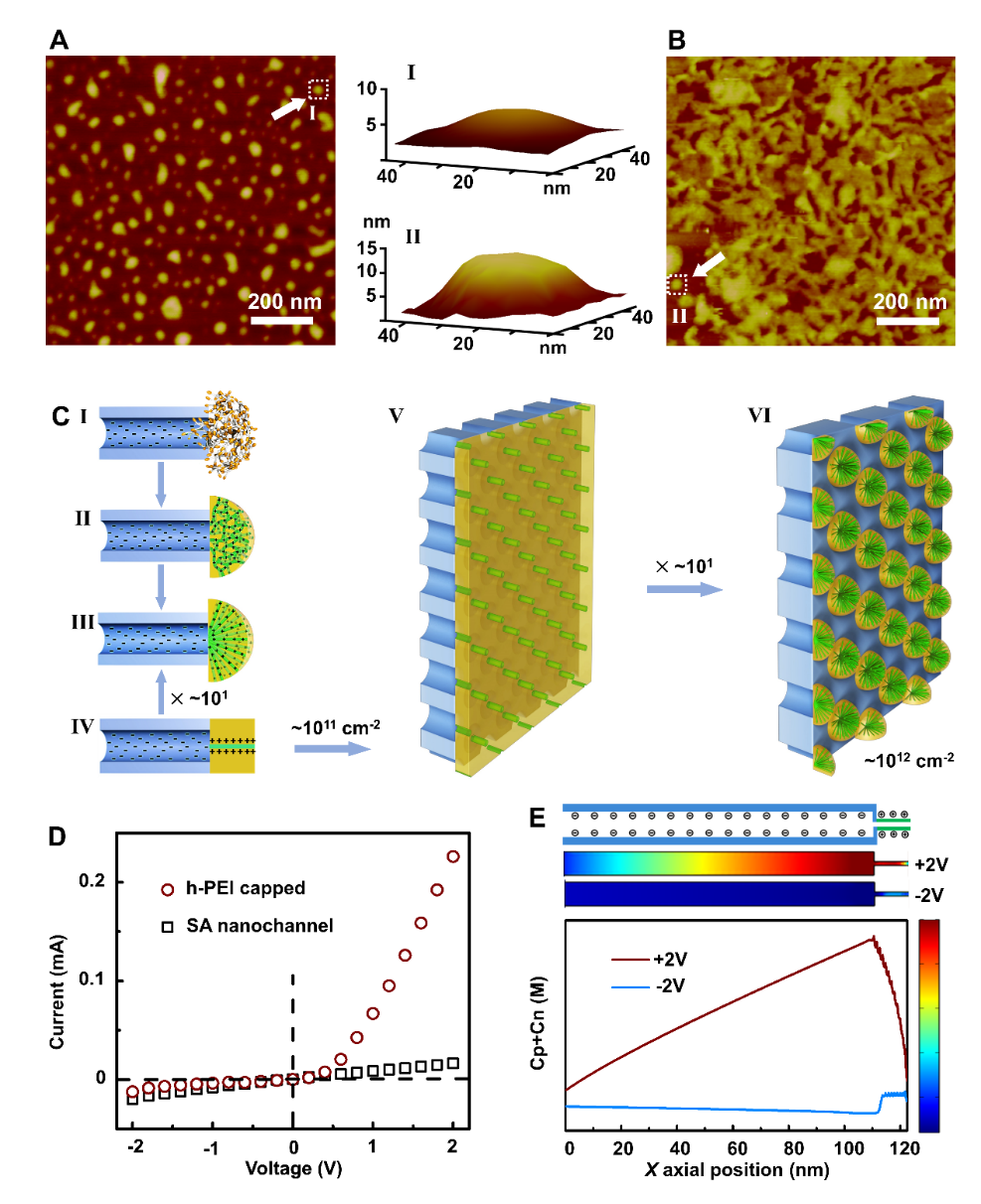 为了解决这一难题,江雷院士、高龙成副教授课题组向自然学习,借鉴了生命体中氯离子通道的结构特点,在已有大面积制备高机械强度、高孔密度聚合膜的基础上(Angew. Chem. Int. Ed. 2016, 55, 13056; J. Am. Chem. Soc. 2017, 139, 8905),将超支化聚乙烯亚胺(PEI)分子精准地修饰纳米孔的端口处,构筑了蘑菇形的不对称纳米孔阵列膜,该方法具有快速、精准、可大面积制备等优势。