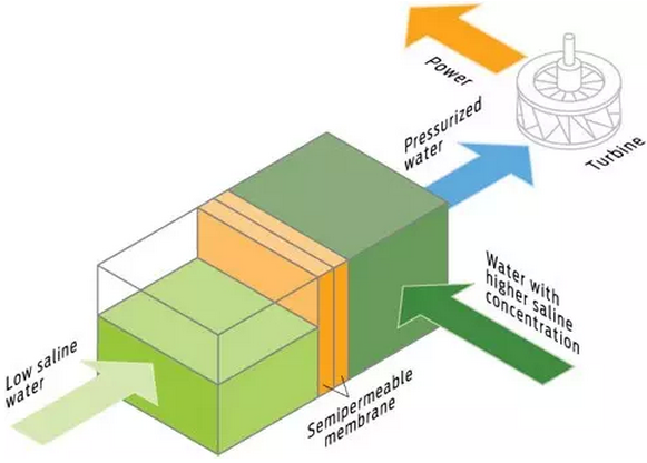 含盐浓度高的海水以较大的渗透压力向淡水扩散,同时淡水以较小的渗透压力向海水扩散。这种渗透压力差所产生的能量,称为“海水盐浓度差能”,也叫“海水盐差能”。